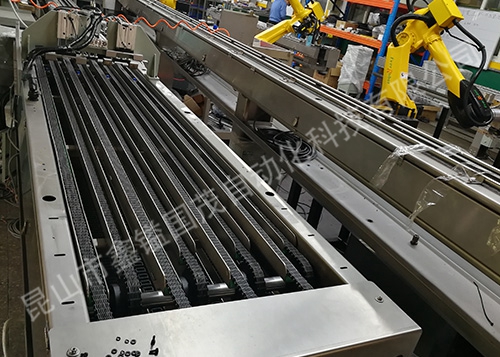 3、链板输送机适合与升降移载输送机、转向输送机、栈板供应收集机等搭配。
